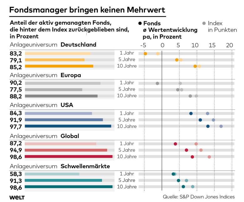 Unten abgebildet, sieht man eine sehr schöne Darstellung der Daten aus SPIVA, welche ich auf welt.de gefunden habe. Diese Graphik ist zwar schon 3 Jahre alt, doch zeigt sie sehr schön die Kernbotschaft von SPIVA: