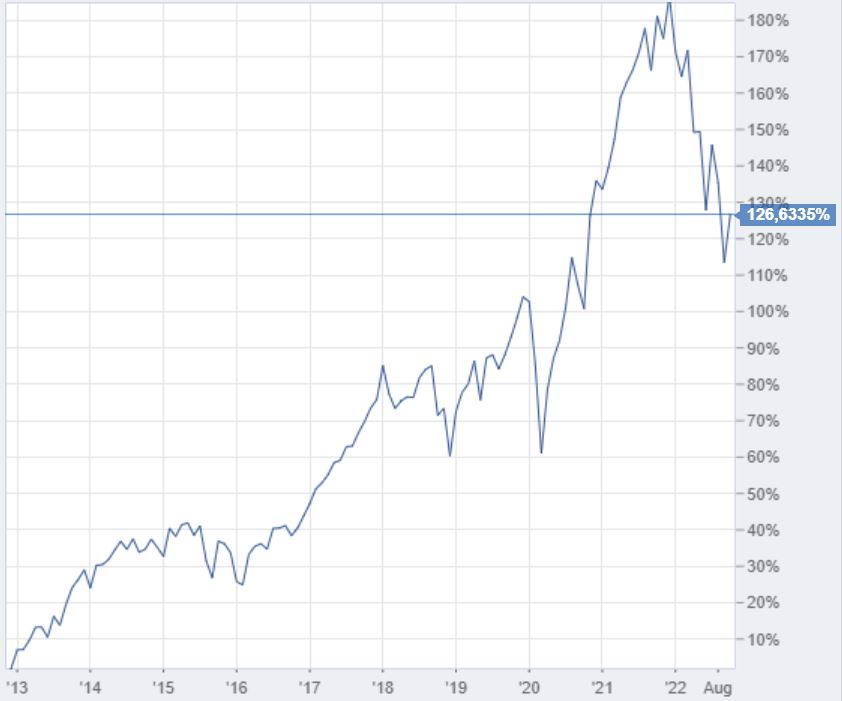 Und hier ein ETF auf den MSCI World über denselben Zeitraum mit einer Rendite von 126,6%.