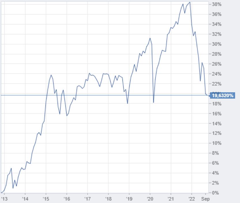 Schauen wir uns also mal die letzten 10 Jahre des Master s Best-Invest B im Vergleich zu einem MSCI World an. Zuerst der aktive Fonds der Sparkasse mit einer Rendite von 19,6% über die letzten 10 Jahre.