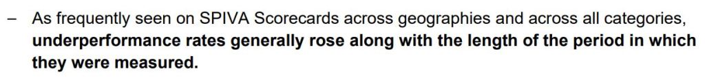 Außerdem sieht man: Je globaler eine Strategie ist (bzw. je höher die Länderdiversifikation ausfällt), desto höher fällt auch der Prozentsatz aus, wo aktive Fonds schlechter performen. Hier sind wir im hohen 90er Bereich.