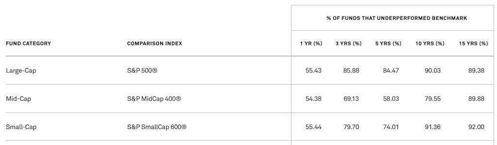 Es lässt sich sofort erkennen, dass über einen langfristigen Zeitraum, aktive gemanagte Fonds zu einem sehr hohen Prozentsatz hinter dem jeweiligen Benchmark-Index (auf denen üblicherweise ETFs abgebildet werden) zurückbleiben.