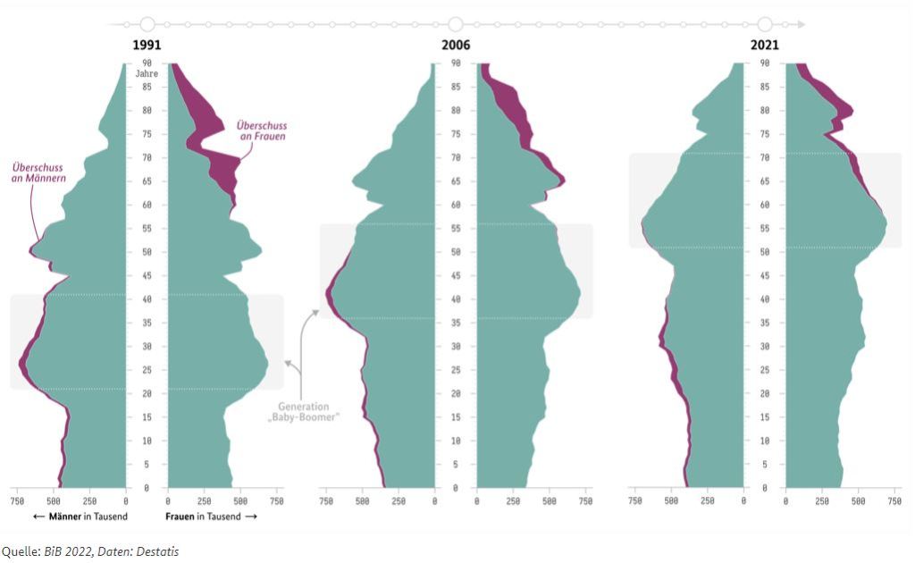 Die in der oberen Abbildung ersichtliche dramatische Steigerung der Zuschüsse des Staates ins Pensionssystem ist nur der Vorgeschmack auf das, was uns bevorsteht, so ehrlich muss man sein. Betrachtet man die Altersstruktur der Bevölkerung, so sieht man in der Alterspyramide die Babyboomer-Generation (all jene, die zwischen ca. 1950 bis Ende der 60er Jahre geboren wurden) immer weiter nach oben wandern (siehe Abbildung unten, welche zwar für die deutsche Bevölkerung gilt, aber recht ähnlich auch in Österreich aussieht). Konkret heißt das, die Babyboomer gehen jetzt langsam in Pension, während am anderen Ende der Bevölkerungspyramide sehr wenig nachkommt. Es wird also immer mehr Pensionisten (Verbraucher im Sozialsystem) und immer weniger Erwerbstätige (Einzahler ins Sozialsystem) geben. Dies könnte zwar durch Zuwanderung abgefedert werden, aber ob das die Bevölkerung will, steht auf einem anderen Blatt. Zusammengefasst muss der Staat auch in Zukunft einen hohen Betrag ins Pensionssystem zuschießen, um dieses am Leben zu erhalten. Das wird sicher noch eine Weile gut gehen, aber bis ich mit meinen 31 Jahren in den Genuss der Pension kommen kann, wird sich noch einiges ändern. So kann der Staat die Leute zwingen, länger zu arbeiten, die Pensionshöhen zurechtstutzen, immer mehr Geld zuschießen oder eine Kombination der 3 vornehmen. Alles keine rosigen Aussichten, die mich ermutigen, der privaten Pensionsvorsorge einen höheren Stellenwert einzuräumen. So wie im Beitrag zum Vergleich Immobilien vs Aktien, wird das hier besprochene Problem auch den Immobiliensektor betreffen, weshalb ich von Immobilien, die noch dazu astronomisch hohe Bewertungen aufweisen, Abstand nehme, wenn es um den Aufbau der 3ten Säule geht. Ist man allerdings auf der Suche nach Wohnungseigentum, welches man selbst nutzen möchte, so werden sich in den nächsten Jahren viele Gelegenheiten bieten, um seinen Traum vom Eigenheim verwirklichen zu können.