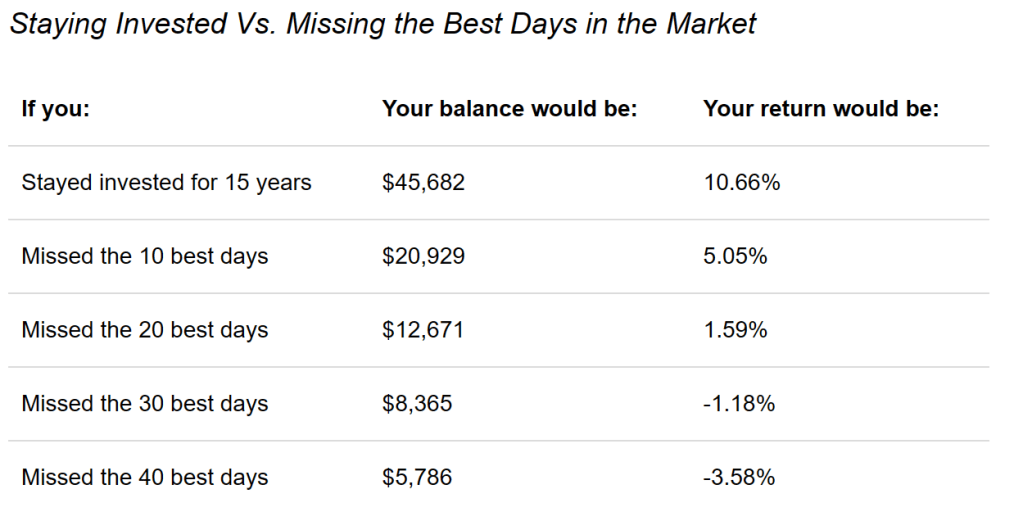 Eine weitere Statistik, die untermauert, wie wichtig es ist investiert zu sein, zeigt folgende Abbildung. Dabei wird der US-amerikanische Aktienindex vom 31.12. 2006 bis 31.12.2021 betrachtet. 10000 $ investiert zu Silvester 2006 sind zu 45682 $ geworden, was einer annualisierten Rendite von 10,66 % / Jahr entspricht. Versuchte man nun den Markt zu timen, und verpasste dadurch die 10 besten Börsentage, so sind am Ende aus 10000 $ „nur“ 20929 $ geworden. Und man sieht auch, je mehr Spitzentage man nicht investiert an der Seitenlinie steht, desto schlechter wird das Ganze.