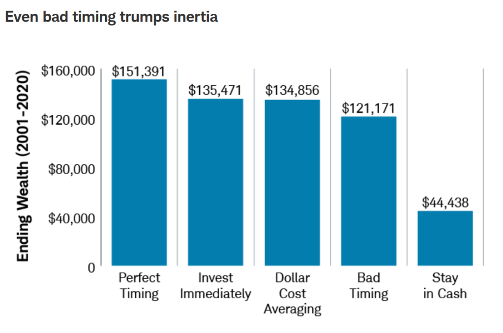 Wenn man sich die Frage dennoch stellt, hier die Antwort: Time in the market, beats timing the market! Auf Deutsch: Zeit im (Kapital) Markt schlägt warten auf den besten Einstiegszeitpunkt in den (Kapital) Markt. Dazu gibt es zahlreiche Studien, die das belegen, unter anderem hier.