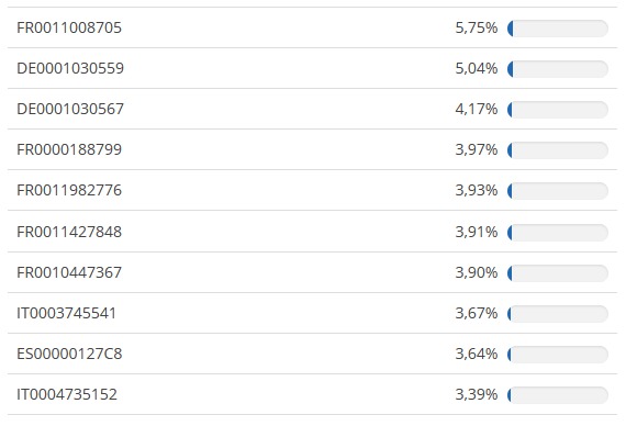 Bevor wir uns die Top 10 anschauen, noch etwas Grundsätzliches: Dieser ETF investiert in inflationsindexierte Staatsanleihen der größten 4 EU-Länder namens Frankreich (46%), Italien (27%), Deutschland (14%) und Spanien (13%). Dabei sind folgende Anleihen am höchsten gewichtet: