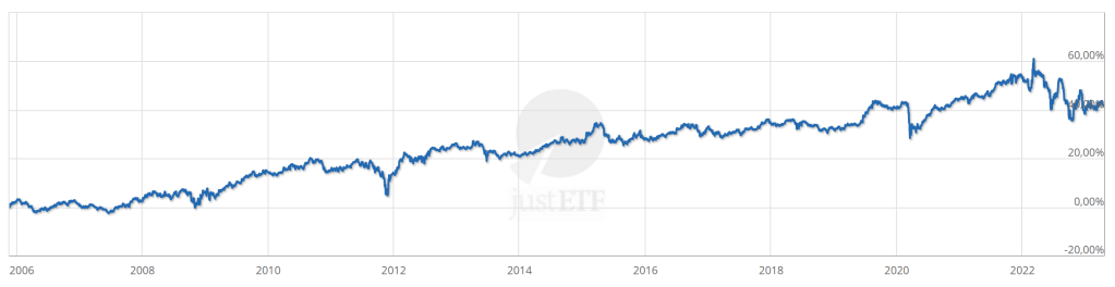 Da dieser ETF Teil meiner Investitionsreserve ist, habe ich eine überschaubare Rendite-Erwartung an dieses Produkt und diese wurde seit meinem Investitionsstart nicht erfüllt, weshalb ich mit diesem ETF momentan nicht allzu glücklich bin, was sich unter anderem auch darin äußert, dass ich schon lange keinen Sparplan mehr auf diesen ETF laufen habe. Aber dieser ETF ist immer noch im Depot und darum hier die Performance seit Fonds-Auflage am 18.11.2005: