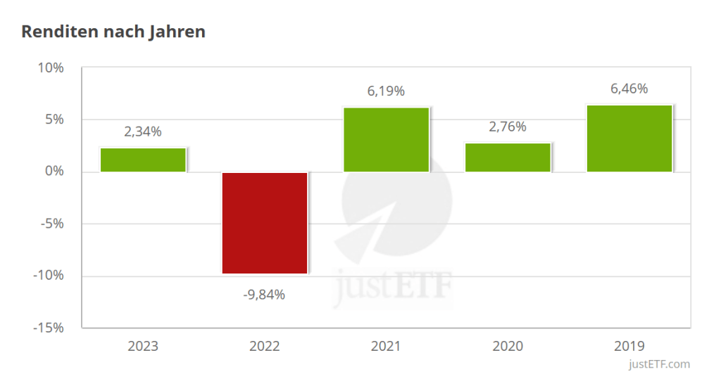 Gut 40 % in den letzten 17 Jahren ist eine solide Rendite für einen Anleihen-ETF. Auch hier erkennen wir ordentliche Einbußen im Jahr 2022, wobei dieser ETF im Vergleich zu anderen Anleihe-ETFs mit einem blauen Auge davongekommen ist (andere Anleihe-ETFs haben teilweise über 40 % im Jahr 2022 eingebüßt). Dafür gibt es 2 Gründe: