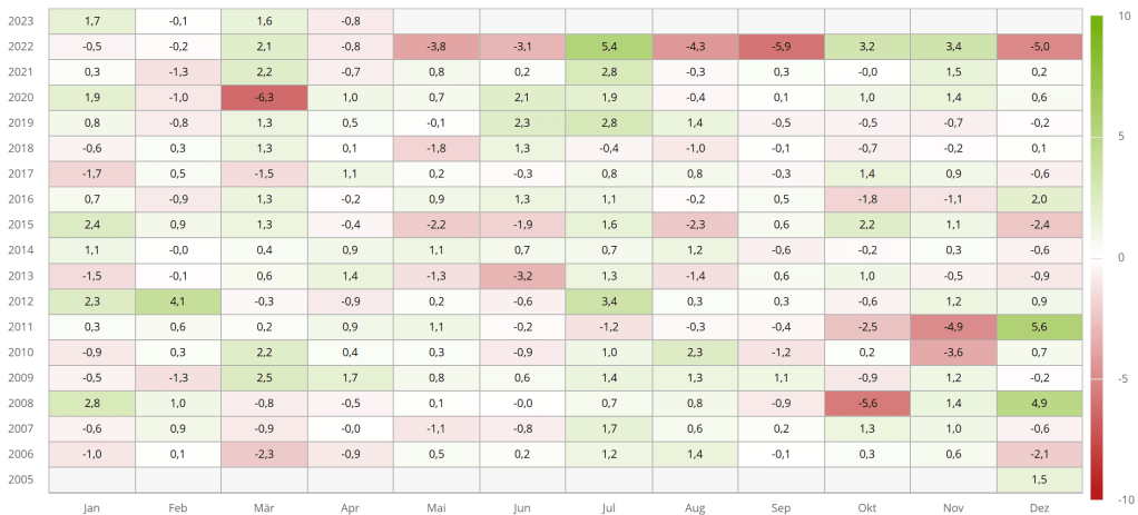 Da dieser ETF schon sehr lange am Markt ist, schaut die Heatmap der Monatsrenditen ziemlich mächtig aus.