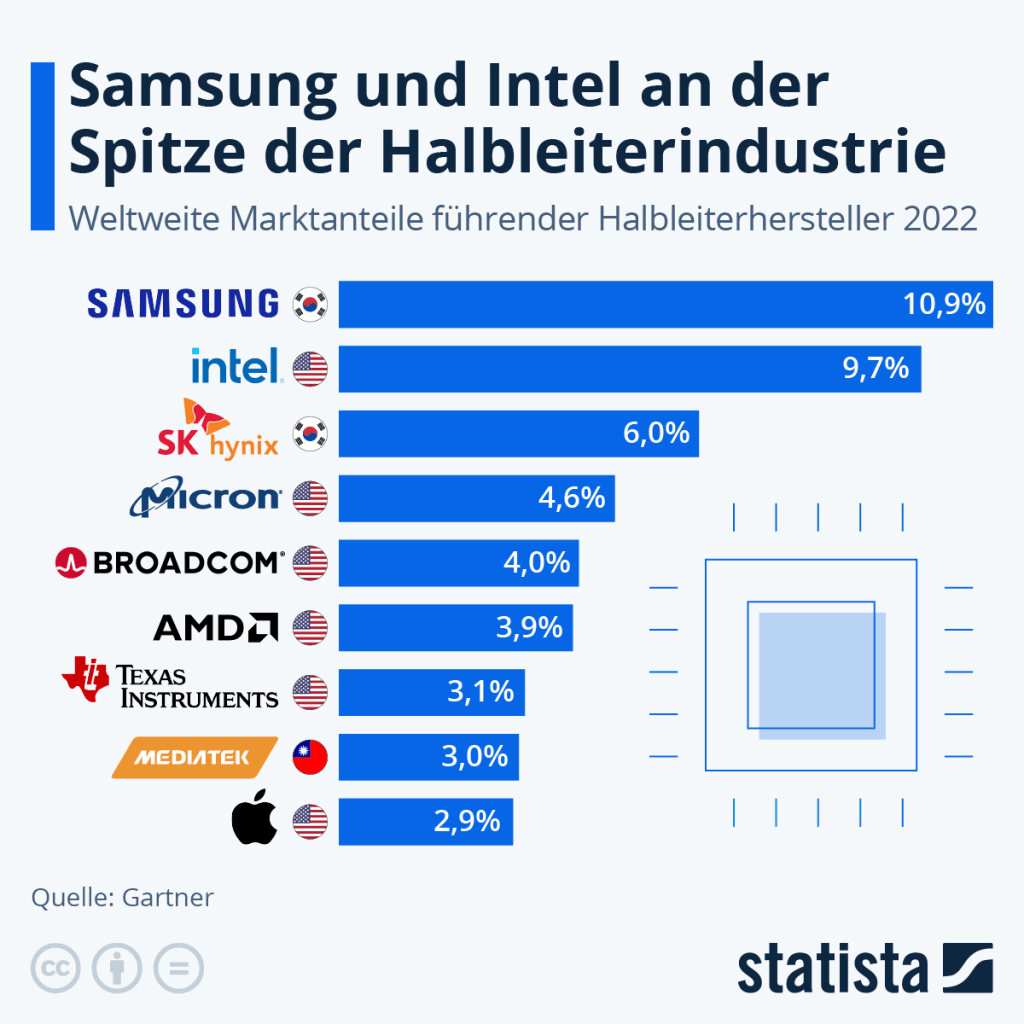 Wie schlecht es um die Halbleiterindustrie in Europa bestellt ist, zeigt diese Statistik, wo die größten Halbleiterhersteller aufgelistet sind und Europa nicht in den Top 10 vertreten ist. In diesem Beitrag schauen wir uns mal an, was eine solche Förderung aus der Sicht von uns Investoren bedeutet.