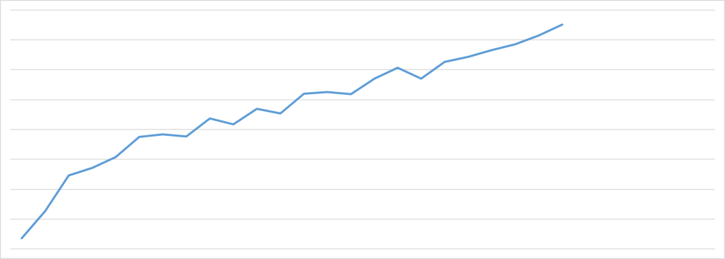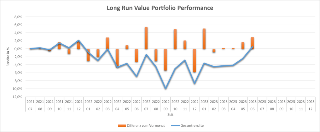 Sein All-time-high (in Prozent) erreichte das Long Run Value Portfolio schon sehr bald nach dem Investitionsstart, und zwar Ende 2021 mit 2,14 %. Von da an ging es dann stetig bergab bis zum Tiefpunkt Anfang Oktober 2022 bei -9,89 %. Anschließend bewegte es sich mit Ausnahme des Dezembers 2022 und des Februars 2023 wieder in die andere Richtung und so stehe ich mit Ende Juni 2023 bei einer Gesamtrendite von 0,54 %. Da ich aber immer brav meine Sparpläne ausgeführt habe und auch nach wie vor ausführe, wurde mit Ausnahme von Februar 2022, April 2022, Juni 2022, September 2022 und Dezember 2022 immer jeden Monat ein neues Allzeithoch erreicht, wenn man auf den Wert des Portfolios schaut. Wie viel genau drinn ist, verrate ich natürlich nicht. Nur soviel sei verraten: Die erste Einzahlung im Juli 2021 waren 7300 €. In der folgenden Abbildung ist der Verlauf, ohne Achsenbeschriftung, dargestellt.