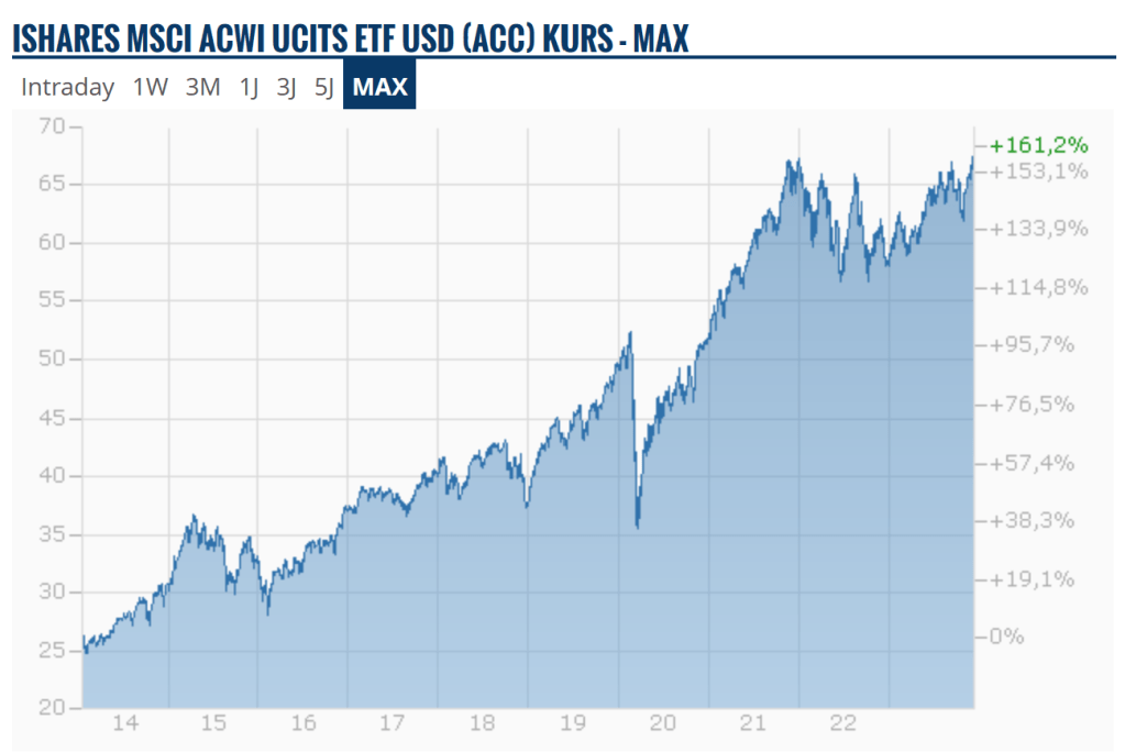 Als Indikator, der mir anzeigt, in welchem Zustand wir gerade sind, eignet sich ein weltweiter Aktienindex, der sowohl Industrienationen als auch Schwellenländer abbildet und der in der nächsten Grafik zu sehen ist.