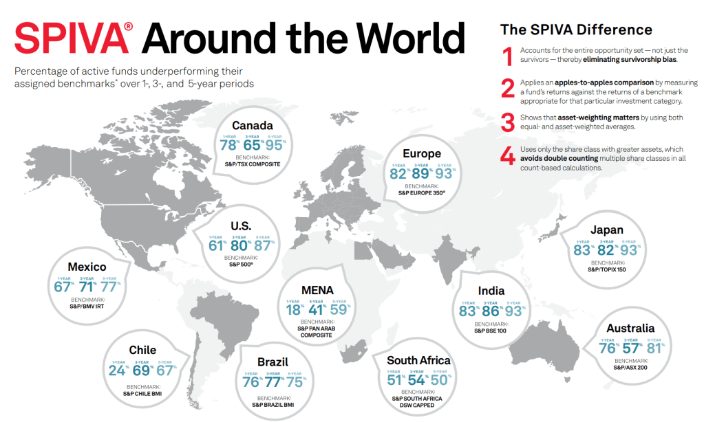 - Je entwickelter der Aktienmarkt (persönliche Einschätzung), desto schlechter performen aktive Fonds. Man braucht nur die Region Europa mit MENA (Middle East North Africa) vergleichen.