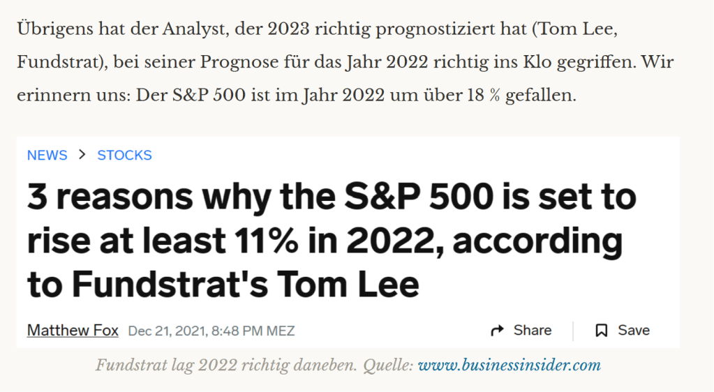 An dieser Stelle sei an den guten Herrn Lee von Fundstrat erinnert, der den amerikanischen Aktienmarkt für 2023 sehr gut vorausgesagt hat, aber eben im Jahr davor komplett daneben lag. Siehe Abbildung unten.