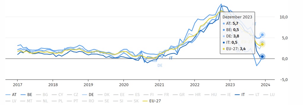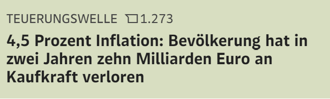 Zunächst scheint es ja eine gute Nachricht gewesen zu sein, dass die Inflationsrate im Jänner 2024 auf 4,5 % gesunken sei. Das bedeutet aber nichts anderes als das der Warenkorb von Herr und Frau Österreicher im ersten Monate des Jahres 2024 um 4,5 % mehr gekostet hat, als noch im Jänner 2023. Immer noch ziemlich weit weg von der Zielinflationsrate von 2 %. Relativ sind wir in Summe 125 % daneben. Das muss man sich mal auf der Zunge zergehen lassen, und immer mal wieder in Erinnerung rufen, wenn sich die Bundesregierung für ihre Anti-Teuerungs-Politik feiern lässt, die in Wahrheit eher ein Reinfall war und noch immer ist.