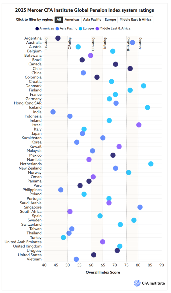 Schwarz auf Weiß zeigt dieses kränkelnde Pensionssystem der aktuelle Mercer CFA Institute Global Pension Index 2025