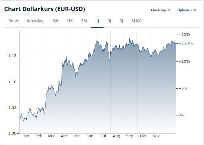 Der US-Dollar wertete massiv ab: Bekam man am 01.01.2025 noch 1,04$ für 1€, so sind es aktuell (01.01.2026) 1,17$, was einem Wertverlust von gut 13% entspricht. (Quelle) Das war natürlich nicht gut für mein Portfolio, aber die weltweite Diversifizierung hat mir trotzdem eine ordentliche Rendite eingebracht, wie wir weiter unten sehen werden.