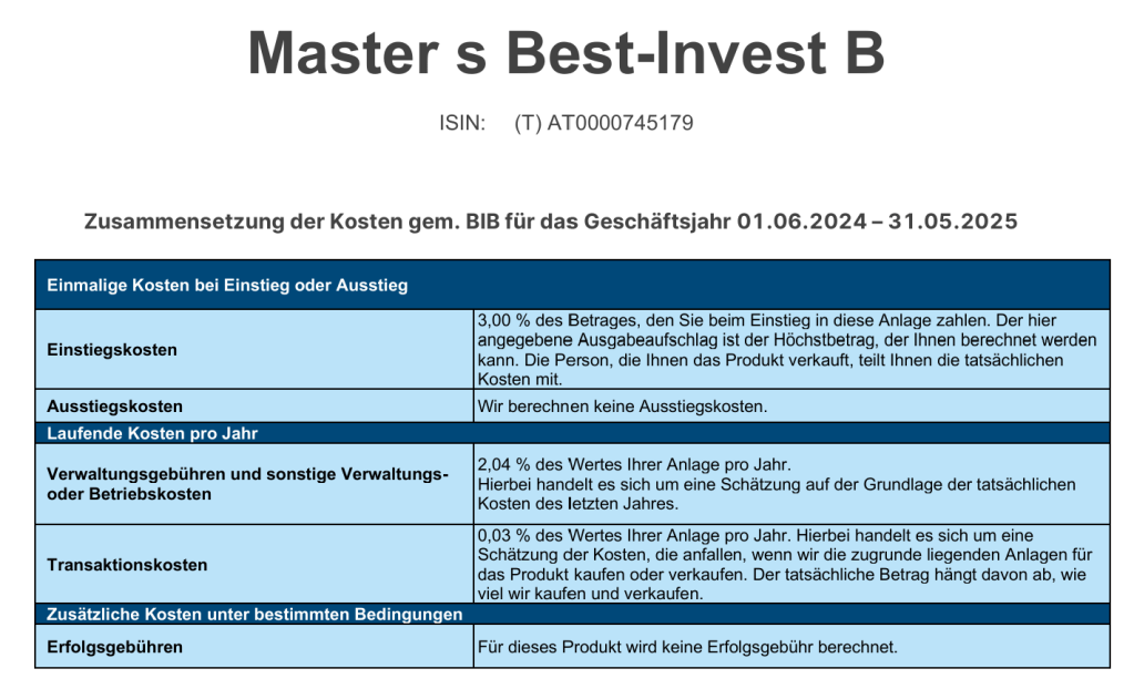 Wie die aufmerksamen Leser wissen, hatte ich bis zu meinem Einstieg bei ETFs einen Fonds meiner Hausbank. Konkret den Master S Best Invest B T Fonds (ISIN: AT0000745179). Ich möchte mit diesem Beitrag wieder ein kleines Update geben, wie sich dieser, kostspielige Fonds im Vergleich zu meinem Portfolio schlägt. Die älteren Beiträge dazu sind hier verlinkt.