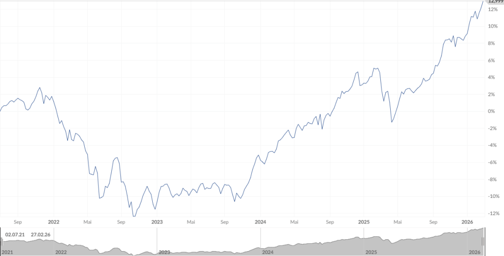 Wie in Portfolio + Performance nachzulesen ist, haben sich meine ETFs in den letzten Jahren blendend entwickelt. Mit Stand Ende Februar 2026 erzielten sie eine Rendite von 41,28% seit meinem Investitionsstart im Juli 2021. Das entspricht einer per anno Rendite von 7,68% Diese Angaben sind inklusive aller Gebühren und seit Frühjahr 2025 auch inklusive Steuern.