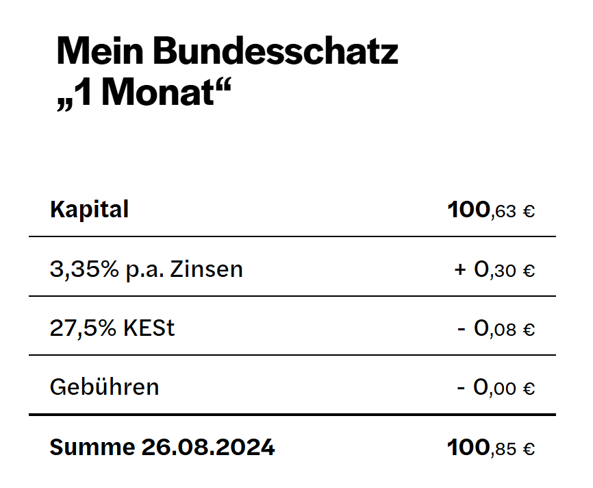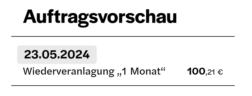 Einwände habe ich keine und somit werden am 23.05.2023 automatisch 100,21 € in Staatspapiere der Republik Österreich mit einer Laufzeit von 1 Monat und einem Zinssatz von 3,5 % pro Jahr weiter veranlagt. Super einfach, keine Gebühren, genau nach meinem Geschmack.