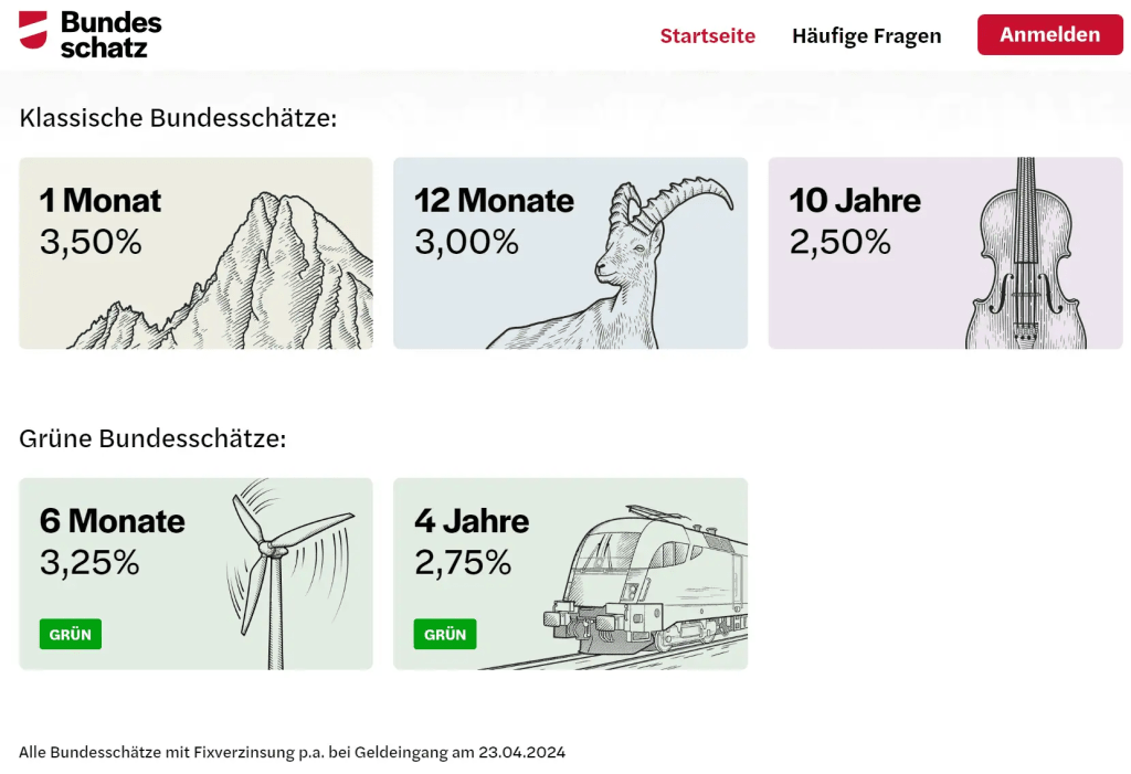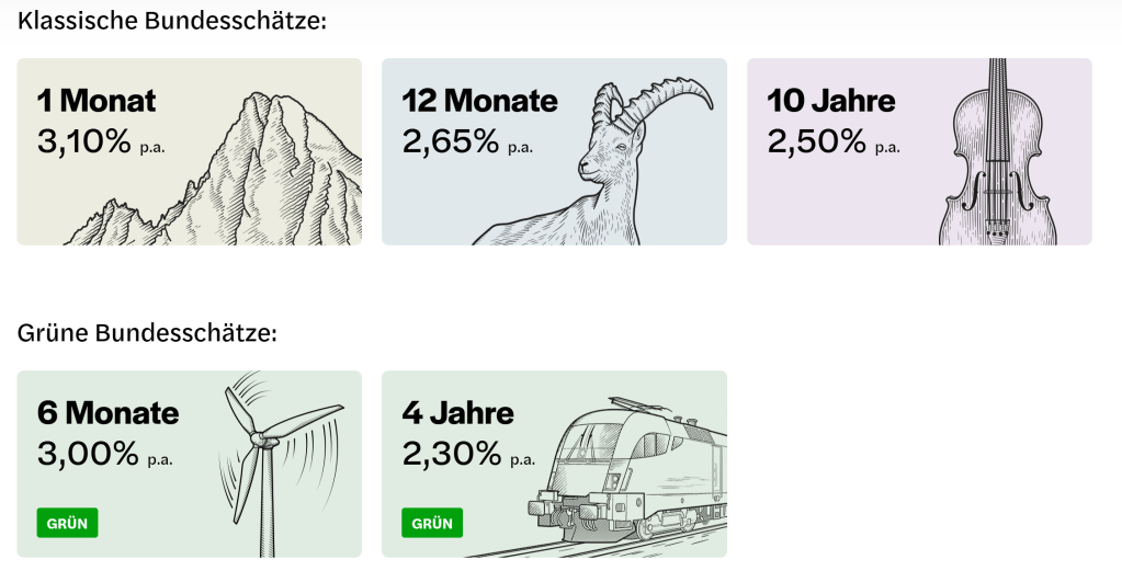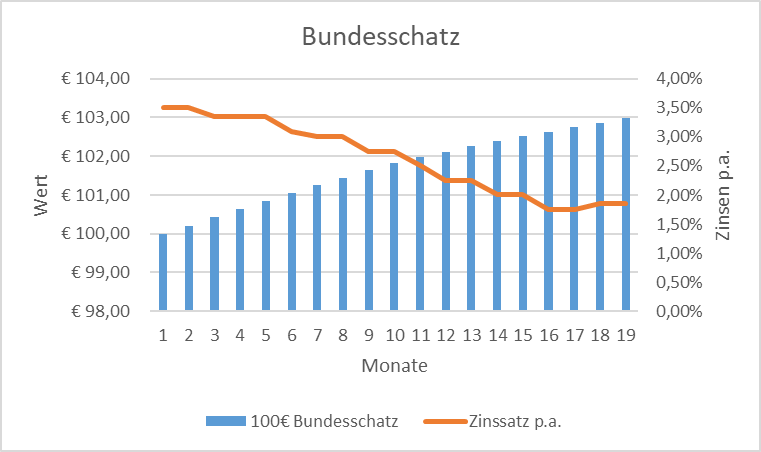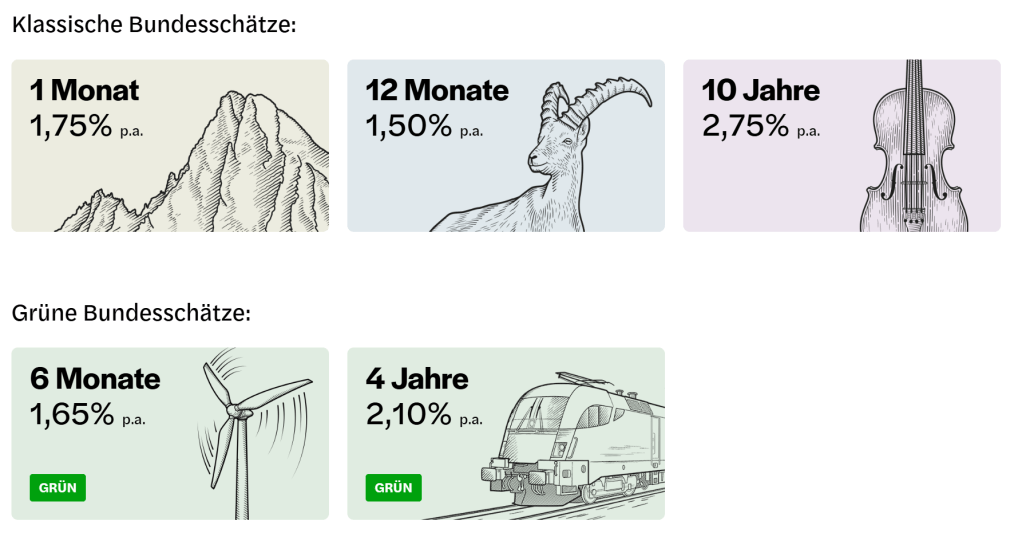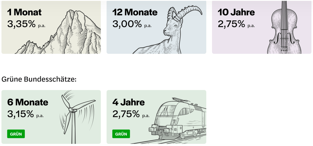 Auch beim Bundesschatz fallen die Zinsen. Für die Weiterveranlagung gibt es nur noch 3,35 %/Jahr anstelle von 3,5 %/Jahr. Die Struktur sieht jetzt folgendermaßen aus: