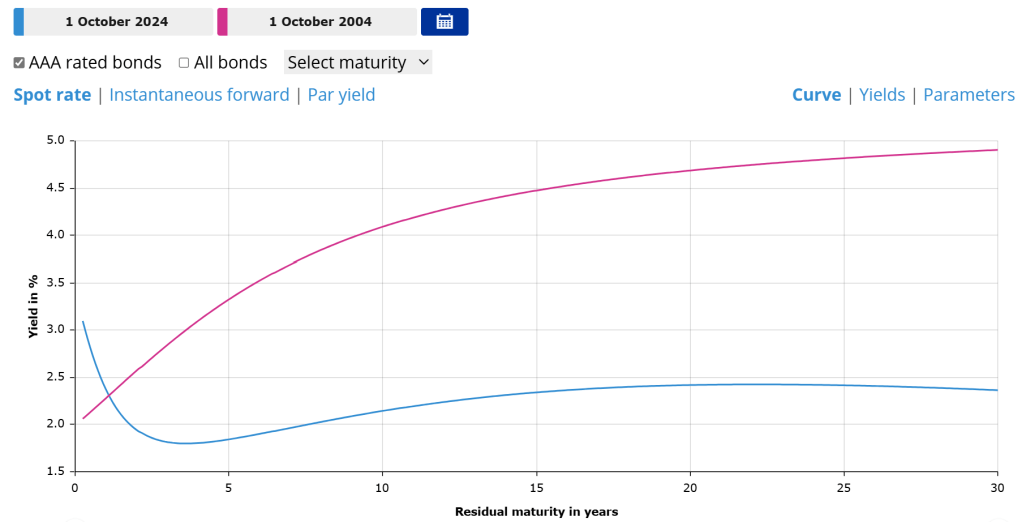 Wie man unschwer erkennen kann, ist die Zinskurve nicht mehr ganz so invers wie im April 2024. Wir sind aber noch ganz weit von einer normalen Zinskurve entfernt. Normal bedeutet hier: Der Zinssatz ist höher, je länger die Laufzeit. Das liegt daran, dass das Ausfallrisiko mit der Zeit steigt. Um das zu illustrieren, hier der Vergleich der aktuellen Zinsstrukturkurve (in blau) mit jener aus dem Oktober 2004 (in rot)
