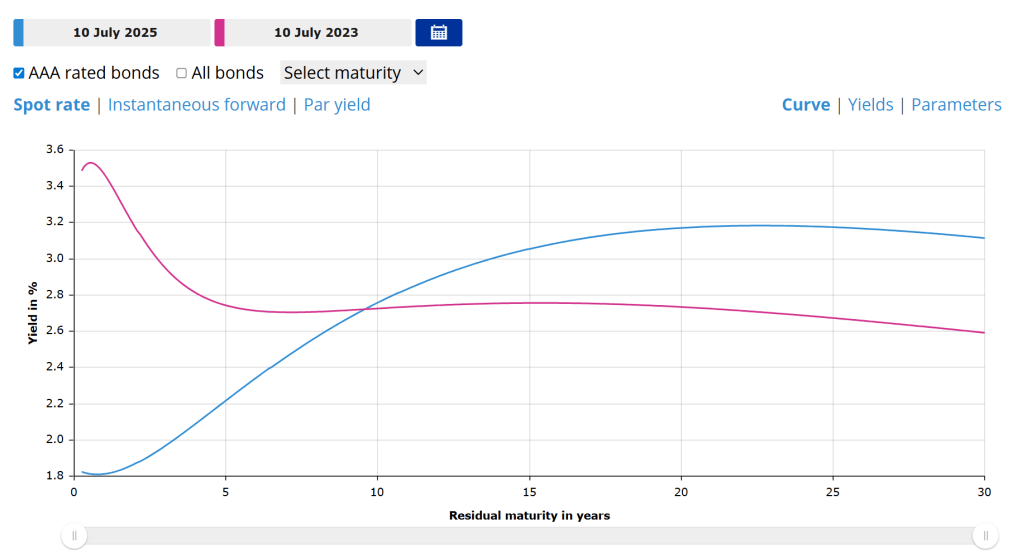 Und hier die Zinsstrukturkurve in der Eurozone. Sehr beeindruckend, was sich da in 2 Jahren getan hat.