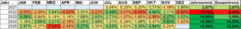 Unten seht ihr die Aufteilung meines Portfolios und die Performance zum jeweiligen Monatsende. Seit Juni 2025 inkl. Steuern.