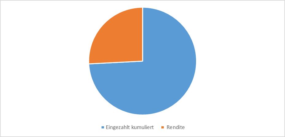 Im Diagramm unten eine Darstellung, wie sich mein Portfolio aus eingezahltem (in blau) und erwirtschaftetem Geld durch Rendite (in orange) zusammensetzt. Der Zinseszins nimmt schön langsam an Fahrt auf.